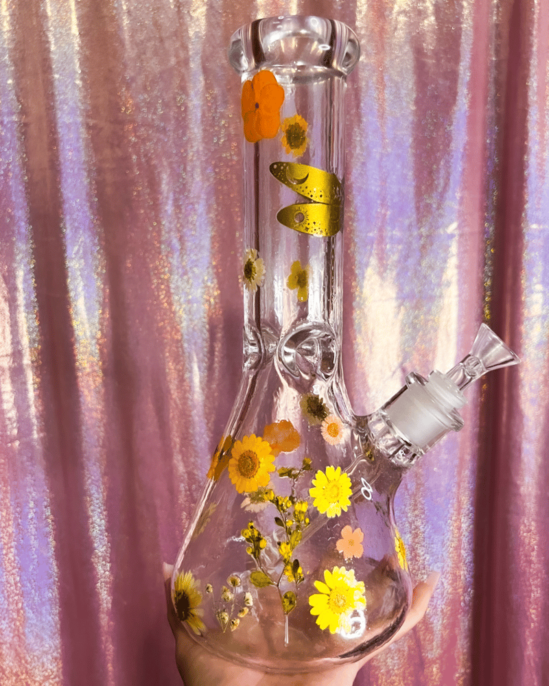 Dreamy Golden Hour Bong. Has a celestial dragonfly with vivid wildflowers and glittery glass.